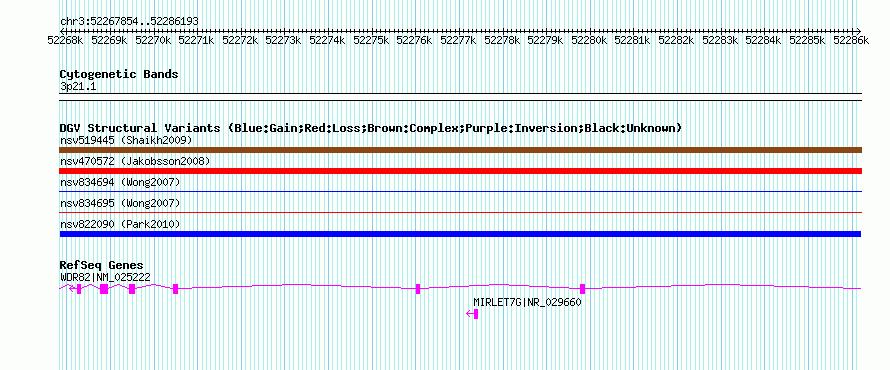 Variant DetailsVariant: nsv822090 | Internal ID | 16431250 | | Landmark | | | Location Information | | | Cytoband | 3p21.1 | | Allele length | | Assembly | Allele length | | hg38 | 18340 | | hg19 | 18340 | | hg18 | 18340 |