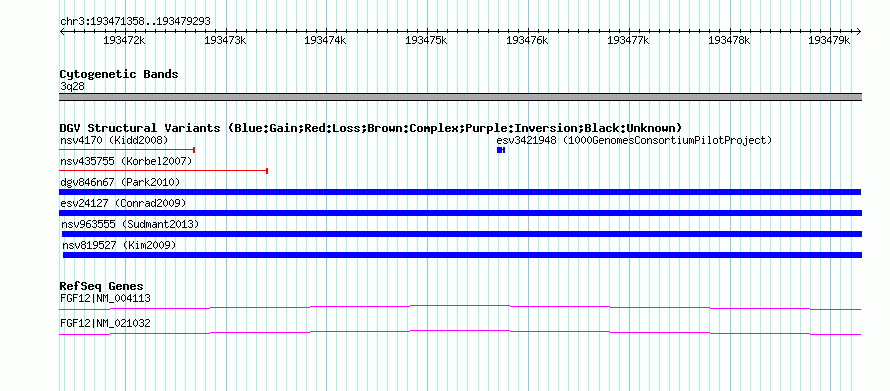 | | Variant Type | CNV gain | | Copy Number | | | Allele State | | | Allele Origin | | | Probe Count | | | Validation Flag | | | Merged Status | M | | Merged Variants | dgv846n67 | | Supporting Variants | nssv1424117, nssv1435010 | | Samples | NA18942, NA18582 | | Known Genes | FGF12 | | Method | Oligo aCGH | | Analysis | To select parameters for calling CNVs (that is, the statistical threshold of the ADM2 algorithm, the minimum +/- log2 ratio and the minimum number of consecutive probes in a CNV interval), we calculated the sensitivity and positive predictive value based on the comparison of aCGH-based CNV calls (using our high-resolution Agilent 24M platform) with read-depth sequence data for two samples from Korean individuals (AK1 and AK2). We attempted to obtain `absolute' copy number status of the sample from NA10851, which was used as the reference sample for aCGH experiments in this study. For this, we used read-depth data for NA10851 obtained from massively parallel sequencing by the Illumina GA II data. The read-depth data represent the copy number status of NA10851 as compared to the human reference genome (hg18) because the short read sequences were aligned to hg18. | | Platform | Agilent 24M aCGH | | Comments | | | Reference | Park_et_al_2010 | | Pubmed ID | 20364138 | | Accession Number(s) | nsv822386