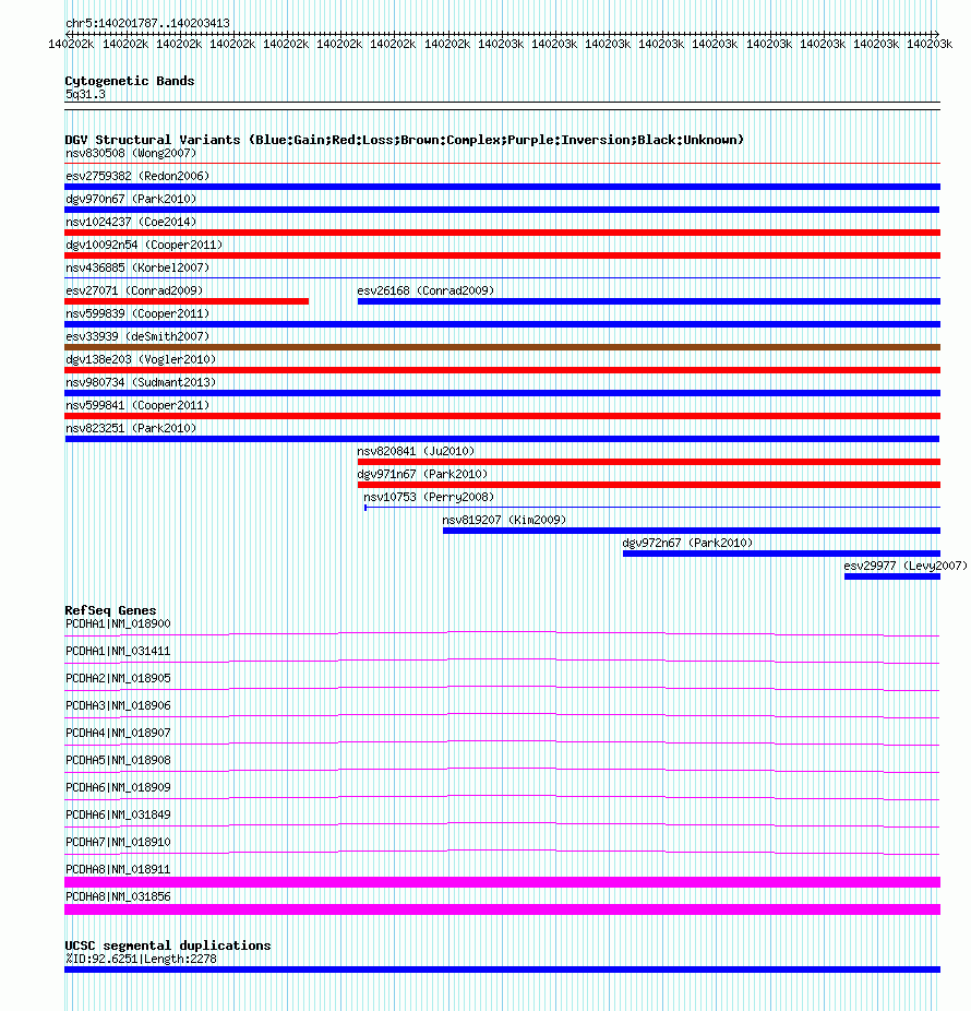 | | Variant Type | CNV gain | | Copy Number | | | Allele State | | | Allele Origin | | | Probe Count | | | Validation Flag | | | Merged Status | M | | Merged Variants | | | Supporting Variants | nssv1428288 | | Samples | AK10 | | Known Genes | PCDHA1, PCDHA2, PCDHA3, PCDHA4, PCDHA5, PCDHA6, PCDHA7, PCDHA8 | | Method | Oligo aCGH | | Analysis | To select parameters for calling CNVs (that is, the statistical threshold of the ADM2 algorithm, the minimum +/- log2 ratio and the minimum number of consecutive probes in a CNV interval), we calculated the sensitivity and positive predictive value based on the comparison of aCGH-based CNV calls (using our high-resolution Agilent 24M platform) with read-depth sequence data for two samples from Korean individuals (AK1 and AK2). We attempted to obtain `absolute' copy number status of the sample from NA10851, which was used as the reference sample for aCGH experiments in this study. For this, we used read-depth data for NA10851 obtained from massively parallel sequencing by the Illumina GA II data. The read-depth data represent the copy number status of NA10851 as compared to the human reference genome (hg18) because the short read sequences were aligned to hg18. | | Platform | Agilent 24M aCGH | | Comments | | | Reference | Park_et_al_2010 | | Pubmed ID | 20364138 | | Accession Number(s) | nsv823251