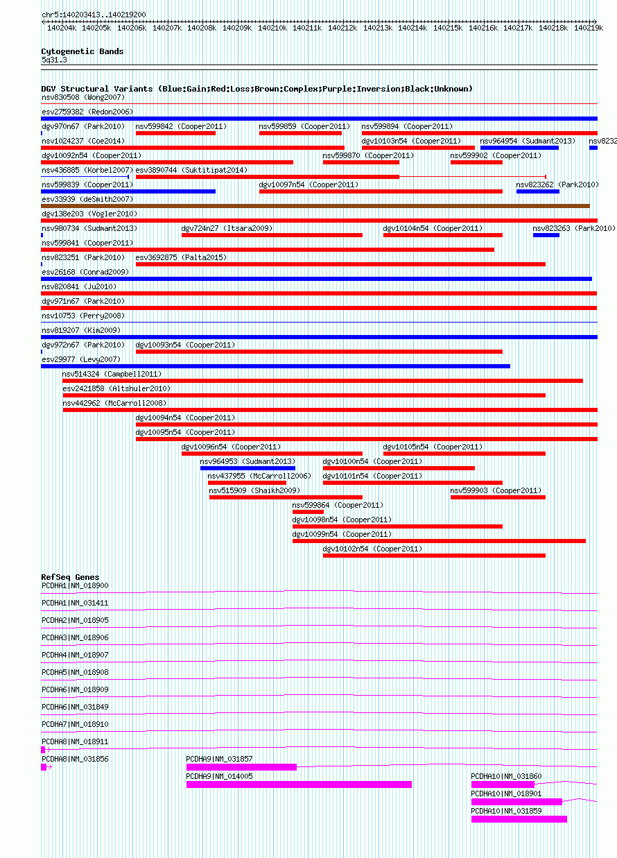 | | Variant Type | CNV loss | | Copy Number | | | Allele State | | | Allele Origin | | | Probe Count | | | Validation Flag | | | Merged Status | M | | Merged Variants | dgv971n67 | | Supporting Variants | nssv1440007, nssv1435094, nssv1431324, nssv1440358, nssv1424222, nssv1439677, nssv1435871, nssv1430589, nssv1427503, nssv1426219, nssv1437450, nssv1436633, nssv1426673, nssv1422611, nssv1433658, nssv1429057, nssv1432880, nssv1438156, nssv1425775, nssv1423412, nssv1426546 | | Samples | NA18947, AK16, NA18999, NA18526, AK6, NA18547, NA18942, NA18582, NA18949, AK8, NA18951, NA18537, NA18566, NA18542, NA18564, AK18, AK12, AK4, NA18972, NA18552, NA18968 | | Known Genes | PCDHA1, PCDHA10, PCDHA2, PCDHA3, PCDHA4, PCDHA5, PCDHA6, PCDHA7, PCDHA8, PCDHA9 | | Method | Oligo aCGH | | Analysis | To select parameters for calling CNVs (that is, the statistical threshold of the ADM2 algorithm, the minimum +/- log2 ratio and the minimum number of consecutive probes in a CNV interval), we calculated the sensitivity and positive predictive value based on the comparison of aCGH-based CNV calls (using our high-resolution Agilent 24M platform) with read-depth sequence data for two samples from Korean individuals (AK1 and AK2). We attempted to obtain `absolute' copy number status of the sample from NA10851, which was used as the reference sample for aCGH experiments in this study. For this, we used read-depth data for NA10851 obtained from massively parallel sequencing by the Illumina GA II data. The read-depth data represent the copy number status of NA10851 as compared to the human reference genome (hg18) because the short read sequences were aligned to hg18. | | Platform | Agilent 24M aCGH | | Comments | | | Reference | Park_et_al_2010 | | Pubmed ID | 20364138 | | Accession Number(s) | nsv823260