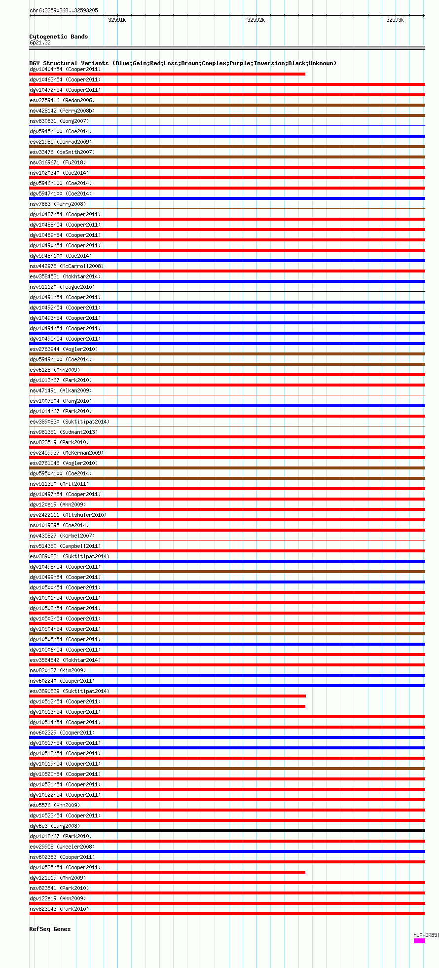 Variant DetailsVariant: nsv823543 | Internal ID | 16432703 | | Landmark | | | Location Information | | | Cytoband | 6p21.32 | | Allele length | | Assembly | Allele length | | hg38 | 2838 | | hg19 | 2838 | | hg18 | 2838 |