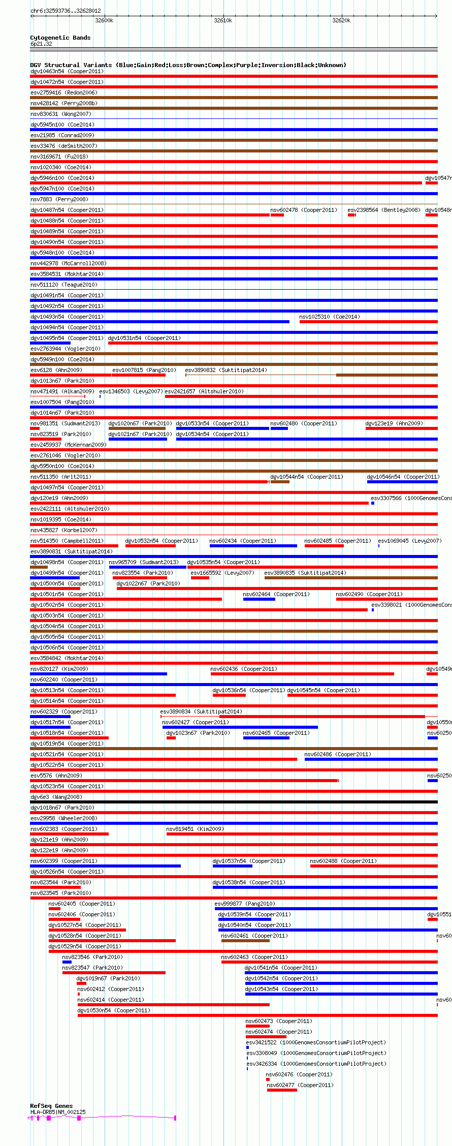 Variant DetailsVariant: nsv823545 | Internal ID | 16432705 | | Landmark | | | Location Information | | | Cytoband | 6p21.32 | | Allele length | | Assembly | Allele length | | hg38 | 34277 | | hg19 | 34277 | | hg18 | 34277 |