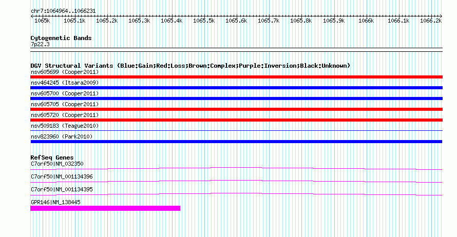 Variant DetailsVariant: nsv823960 | Internal ID | 16433120 | | Landmark | | | Location Information | | | Cytoband | 7p22.3 | | Allele length | | Assembly | Allele length | | hg38 | 1268 | | hg19 | 1268 | | hg18 | 1268 |