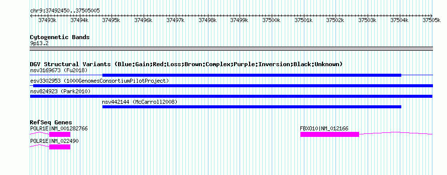 Variant DetailsVariant: nsv824923 | Internal ID | 16434083 | | Landmark | | | Location Information | | | Cytoband | 9p13.2 | | Allele length | | Assembly | Allele length | | hg38 | 12556 | | hg19 | 12556 | | hg18 | 12556 |