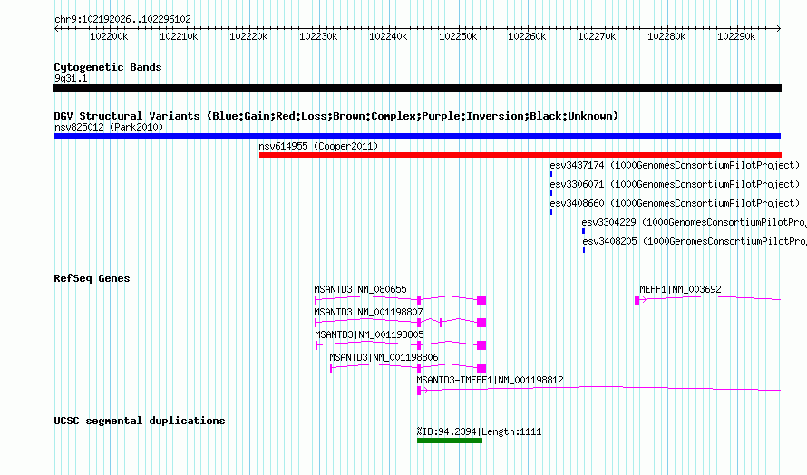 Variant DetailsVariant: nsv825012 | Internal ID | 16087486 | | Landmark | | | Location Information | | | Cytoband | 9q31.1 | | Allele length | | Assembly | Allele length | | hg38 | 104077 | | hg19 | 104077 | | hg18 | 104077 |