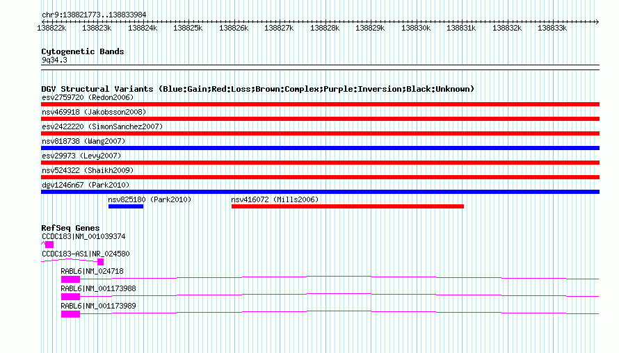 Variant DetailsVariant: nsv825178 | Internal ID | 16434338 | | Landmark | | | Location Information | | | Cytoband | 9q34.3 | | Allele length | | Assembly | Allele length | | hg38 | 12212 | | hg19 | 12212 | | hg18 | 12212 |