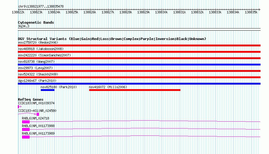Variant DetailsVariant: nsv825179 | Internal ID | 16434339 | | Landmark | | | Location Information | | | Cytoband | 9q34.3 | | Allele length | | Assembly | Allele length | | hg38 | 13502 | | hg19 | 13502 | | hg18 | 13502 |