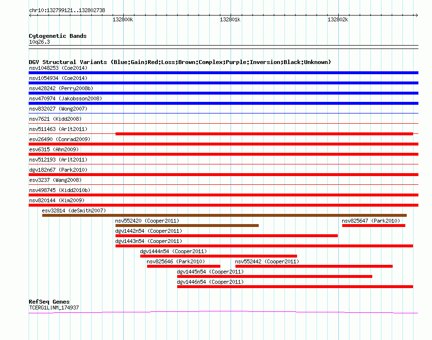 Variant DetailsVariant: nsv825641 | Internal ID | 16434801 | | Landmark | | | Location Information | | | Cytoband | 10q26.3 | | Allele length | | Assembly | Allele length | | hg38 | 3618 | | hg19 | 3618 | | hg18 | 3618 |