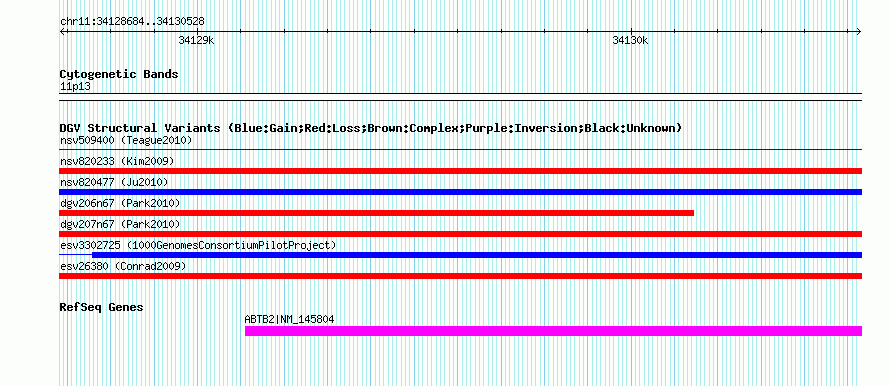 Variant DetailsVariant: nsv825828 | Internal ID | 16434988 | | Landmark | | | Location Information | | | Cytoband | 11p13 | | Allele length | | Assembly | Allele length | | hg38 | 1845 | | hg19 | 1845 | | hg18 | 1845 |