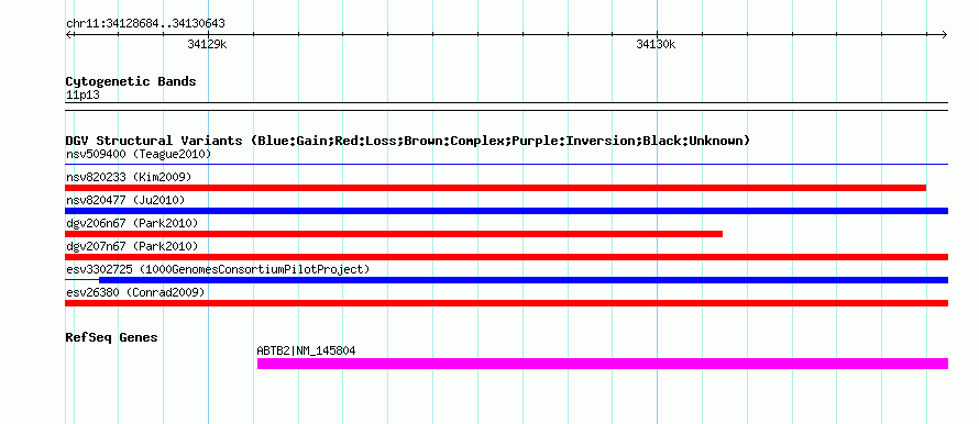 Variant DetailsVariant: nsv825830 | Internal ID | 16434990 | | Landmark | | | Location Information | | | Cytoband | 11p13 | | Allele length | | Assembly | Allele length | | hg38 | 1960 | | hg19 | 1960 | | hg18 | 1960 |
