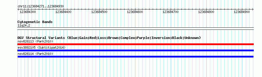 Variant DetailsVariant: nsv826114 | Internal ID | 16435274 | | Landmark | | | Location Information | | | Cytoband | 11q24.2 | | Allele length | | Assembly | Allele length | | hg38 | 660 | | hg19 | 660 | | hg18 | 660 |