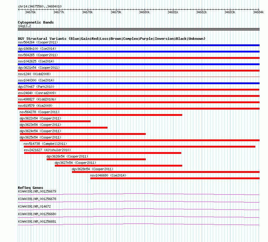 Variant DetailsVariant: nsv826918 | Internal ID | 16436078 | | Landmark | | | Location Information | | | Cytoband | 14q13.2 | | Allele length | | Assembly | Allele length | | hg38 | 8451 | | hg19 | 8451 | | hg18 | 8451 |