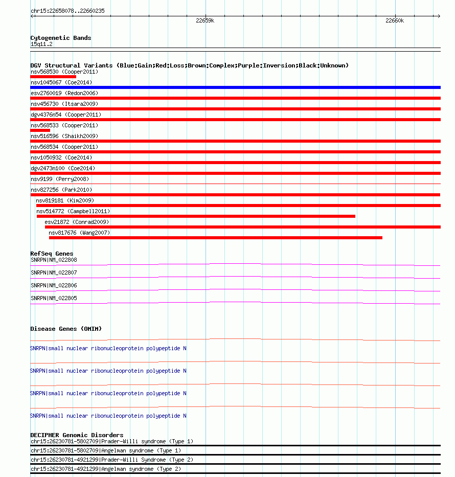 Variant DetailsVariant: nsv827256 | Internal ID | 16436416 | | Landmark | | | Location Information | | | Cytoband | 15q11.2 | | Allele length | | Assembly | Allele length | | hg38 | 2158 | | hg19 | 2158 | | hg18 | 2158 |