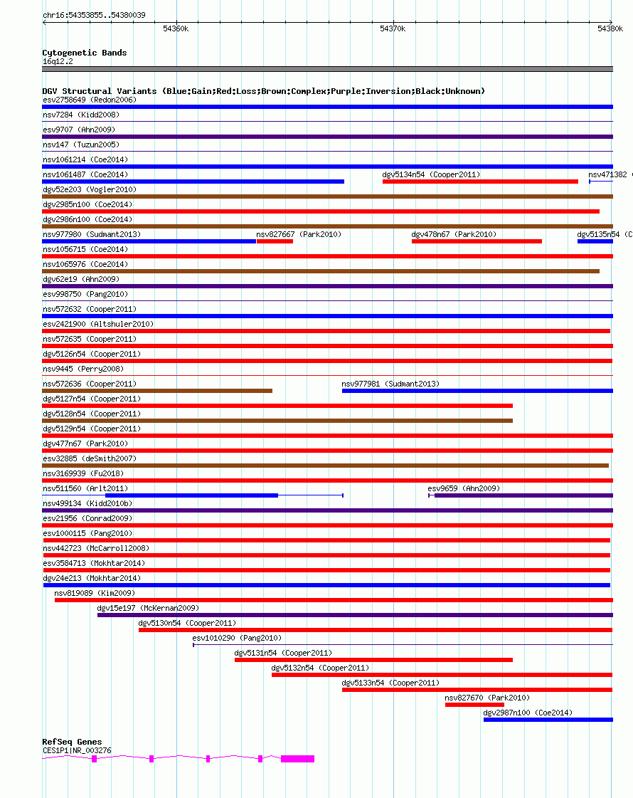 Variant DetailsVariant: nsv827663 | Internal ID | 16436823 | | Landmark | | | Location Information | | | Cytoband | 16q12.2 | | Allele length | | Assembly | Allele length | | hg38 | 26185 | | hg19 | 26185 | | hg18 | 26185 |