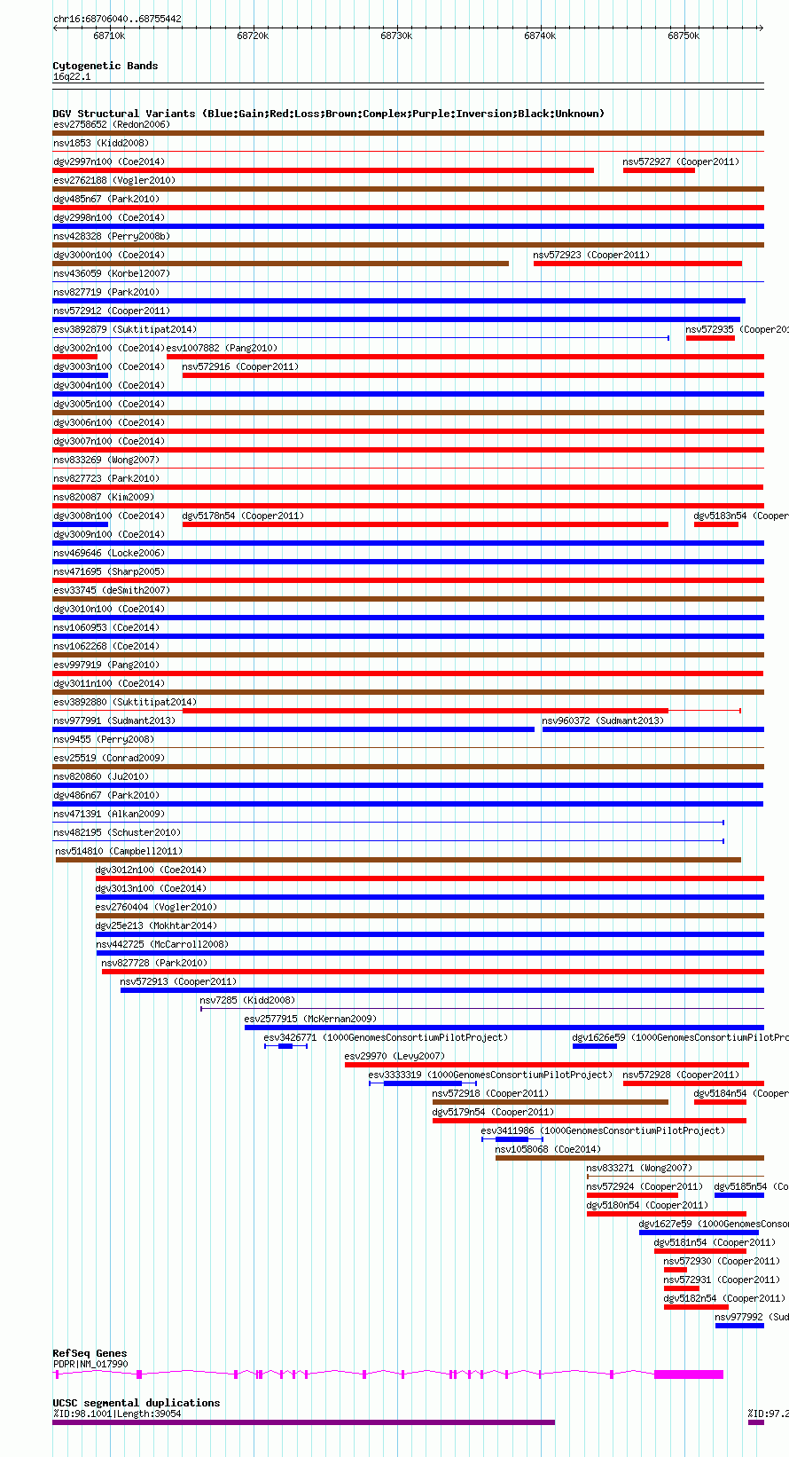 Variant DetailsVariant: nsv827726 Internal ID | 16090200 | Landmark | | Location Information | | Cytoband | 16q22.1 | Allele length | Assembly | Allele length | hg38 | 49403 | hg19 | 49403 | hg18 | 49403 |