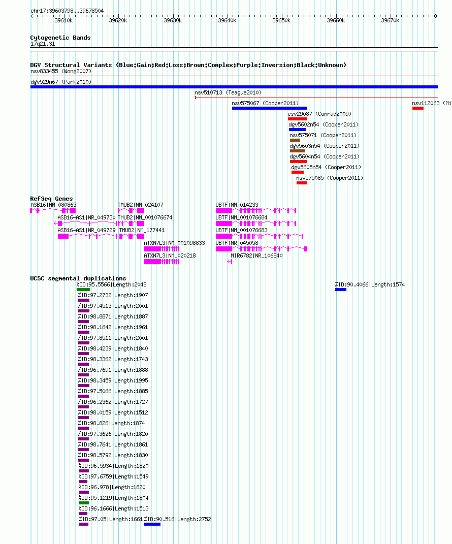 Variant DetailsVariant: nsv828016 | Internal ID | 16090490 | | Landmark | | | Location Information | | | Cytoband | 17q21.31 | | Allele length | | Assembly | Allele length | | hg38 | 74707 | | hg19 | 74707 | | hg18 | 74707 |