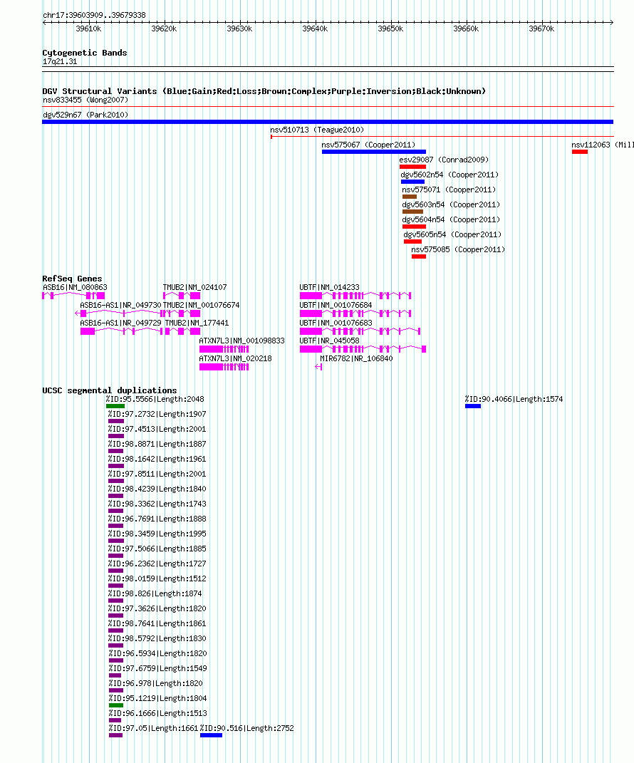 Variant DetailsVariant: nsv828017 | Internal ID | 16090491 | | Landmark | | | Location Information | | | Cytoband | 17q21.31 | | Allele length | | Assembly | Allele length | | hg38 | 75430 | | hg19 | 75430 | | hg18 | 75430 |