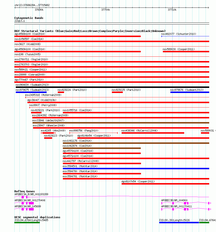 | Variant Type | CNV loss | Copy Number | | Allele State | | Allele Origin | | Probe Count | | Validation Flag | | Merged Status | M | Merged Variants | dgv770n67 | Supporting Variants | nssv1439434 | Samples | NA18973 | Known Genes | APOBEC3A, APOBEC3A_B, APOBEC3B | Method | Oligo aCGH | Analysis | To select parameters for calling CNVs (that is, the statistical threshold of the ADM2 algorithm, the minimum +/- log2 ratio and the minimum number of consecutive probes in a CNV interval), we calculated the sensitivity and positive predictive value based on the comparison of aCGH-based CNV calls (using our high-resolution Agilent 24M platform) with read-depth sequence data for two samples from Korean individuals (AK1 and AK2). We attempted to obtain `absolute' copy number status of the sample from NA10851, which was used as the reference sample for aCGH experiments in this study. For this, we used read-depth data for NA10851 obtained from massively parallel sequencing by the Illumina GA II data. The read-depth data represent the copy number status of NA10851 as compared to the human reference genome (hg18) because the short read sequences were aligned to hg18. | Platform | Agilent 24M aCGH | Comments | | Reference | Park_et_al_2010 | Pubmed ID | 20364138 | Accession Number(s) | nsv829214