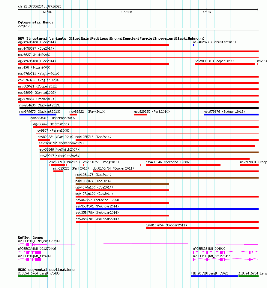 | Variant Type | CNV loss | Copy Number | | Allele State | | Allele Origin | | Probe Count | | Validation Flag | | Merged Status | M | Merged Variants | dgv770n67 | Supporting Variants | nssv1425477, nssv1434143 | Samples | AK2, NA18526 | Known Genes | APOBEC3A, APOBEC3A_B, APOBEC3B | Method | Oligo aCGH | Analysis | To select parameters for calling CNVs (that is, the statistical threshold of the ADM2 algorithm, the minimum +/- log2 ratio and the minimum number of consecutive probes in a CNV interval), we calculated the sensitivity and positive predictive value based on the comparison of aCGH-based CNV calls (using our high-resolution Agilent 24M platform) with read-depth sequence data for two samples from Korean individuals (AK1 and AK2). We attempted to obtain `absolute' copy number status of the sample from NA10851, which was used as the reference sample for aCGH experiments in this study. For this, we used read-depth data for NA10851 obtained from massively parallel sequencing by the Illumina GA II data. The read-depth data represent the copy number status of NA10851 as compared to the human reference genome (hg18) because the short read sequences were aligned to hg18. | Platform | Agilent 24M aCGH | Comments | | Reference | Park_et_al_2010 | Pubmed ID | 20364138 | Accession Number(s) | nsv829215