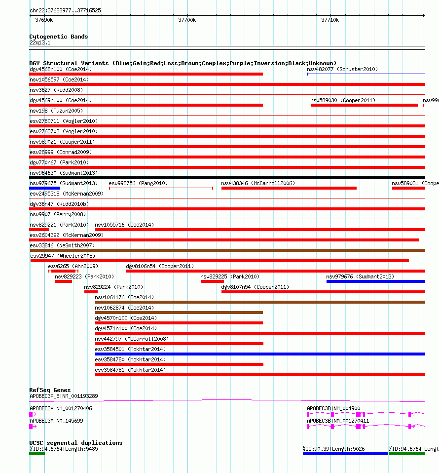 | Variant Type | CNV loss | Copy Number | | Allele State | | Allele Origin | | Probe Count | | Validation Flag | | Merged Status | M | Merged Variants | dgv770n67 | Supporting Variants | nssv1432627 | Samples | AK20 | Known Genes | APOBEC3A, APOBEC3A_B, APOBEC3B | Method | Oligo aCGH | Analysis | To select parameters for calling CNVs (that is, the statistical threshold of the ADM2 algorithm, the minimum +/- log2 ratio and the minimum number of consecutive probes in a CNV interval), we calculated the sensitivity and positive predictive value based on the comparison of aCGH-based CNV calls (using our high-resolution Agilent 24M platform) with read-depth sequence data for two samples from Korean individuals (AK1 and AK2). We attempted to obtain `absolute' copy number status of the sample from NA10851, which was used as the reference sample for aCGH experiments in this study. For this, we used read-depth data for NA10851 obtained from massively parallel sequencing by the Illumina GA II data. The read-depth data represent the copy number status of NA10851 as compared to the human reference genome (hg18) because the short read sequences were aligned to hg18. | Platform | Agilent 24M aCGH | Comments | | Reference | Park_et_al_2010 | Pubmed ID | 20364138 | Accession Number(s) | nsv829222