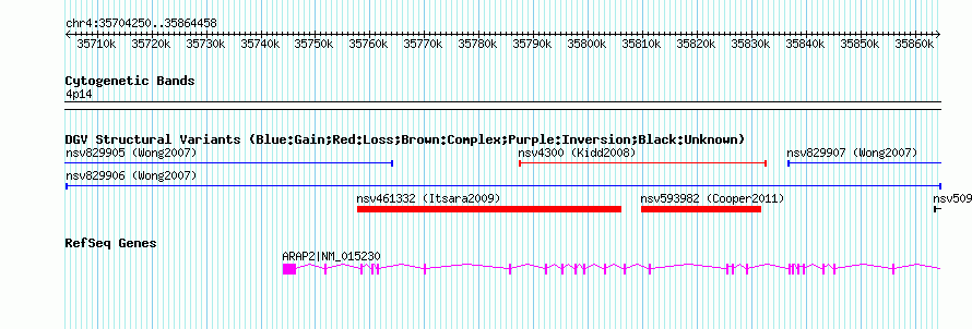 | | Variant Type | CNV gain | | Copy Number | | | Allele State | | | Allele Origin | | | Probe Count | | | Validation Flag | | | Merged Status | M | | Merged Variants | | | Supporting Variants | nssv1443558, nssv1443561, nssv1443559, nssv1443560 | | Samples | | | Known Genes | ARAP2 | | Method | BAC aCGH | | Analysis | Experimental SDs (SDautosome) were calculated for each experiment on the basis of the log2 ratios of the 24,392 reliable clones minus the clones removed because of low signal-to-noise ratio (SNR) or high SD of replicate clone measures (SDclone). Thresholds for determining CNV clones were set at a multiple of the SDautosome value. For each experiment, clones were annotated as uninformative if they were filtered via SNR or SDclone, as a CNV loss if the log2 ratio was less than the negative threshold, as unchanged if the log2 ratio was between the negative and positive thresholds, and as a CNV gain if the log2 ratio was above the positive threshold. | | Platform | GPL2616 | | Comments | | | Reference | Wong_et_al_2007 | | Pubmed ID | 17160897 | | Accession Number(s) | nsv829906
