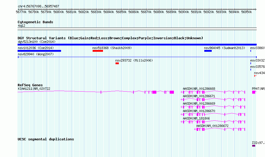 Variant DetailsVariant: nsv829940 Internal ID | 16107123 | Landmark | | Location Information | | Cytoband | 4q12 | Allele length | Assembly | Allele length | hg38 | 190390 | hg19 | 190390 | hg18 | 190390 | hg17 | 190390 |