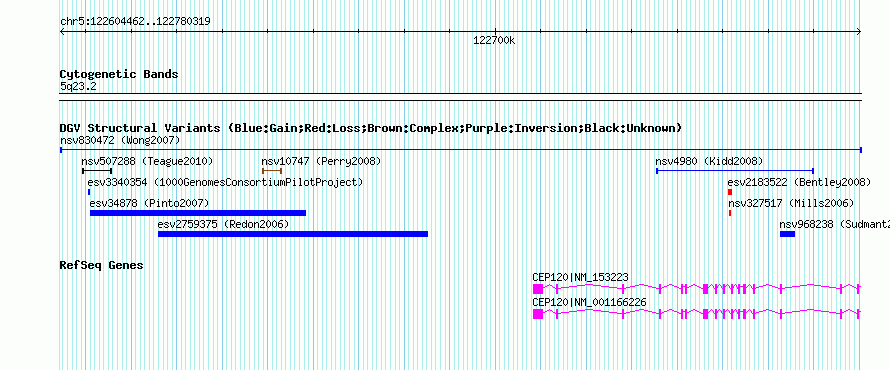 | | Variant Type | CNV gain | | Copy Number | | | Allele State | | | Allele Origin | | | Probe Count | | | Validation Flag | | | Merged Status | M | | Merged Variants | | | Supporting Variants | nssv1445033, nssv1445030, nssv1445031, nssv1445039, nssv1445036, nssv1445038, nssv1445035, nssv1445037, nssv1445043, nssv1445041, nssv1445032, nssv1445042, nssv1445034 | | Samples | | | Known Genes | CEP120 | | Method | BAC aCGH | | Analysis | Experimental SDs (SDautosome) were calculated for each experiment on the basis of the log2 ratios of the 24,392 reliable clones minus the clones removed because of low signal-to-noise ratio (SNR) or high SD of replicate clone measures (SDclone). Thresholds for determining CNV clones were set at a multiple of the SDautosome value. For each experiment, clones were annotated as uninformative if they were filtered via SNR or SDclone, as a CNV loss if the log2 ratio was less than the negative threshold, as unchanged if the log2 ratio was between the negative and positive thresholds, and as a CNV gain if the log2 ratio was above the positive threshold. | | Platform | GPL2616 | | Comments | | | Reference | Wong_et_al_2007 | | Pubmed ID | 17160897 | | Accession Number(s) | nsv830472