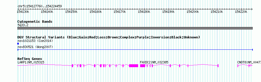Variant DetailsVariant: nsv830521 Internal ID | 16107704 | Landmark | | Location Information | | Cytoband | 5q33.2 | Allele length | Assembly | Allele length | hg38 | 96700 | hg19 | 96700 | hg18 | 96700 | hg17 | 96700 |