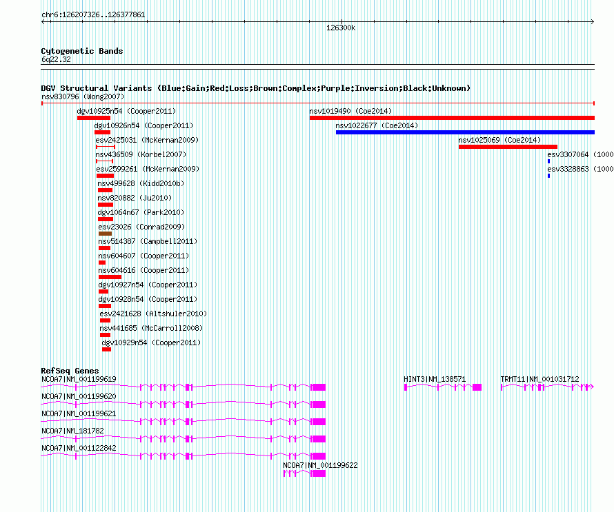 Variant DetailsVariant: nsv830796 Internal ID | 16107979 | Landmark | | Location Information | | Cytoband | 6q22.32 | Allele length | Assembly | Allele length | hg38 | 170536 | hg19 | 170536 | hg18 | 170536 | hg17 | 170536 |