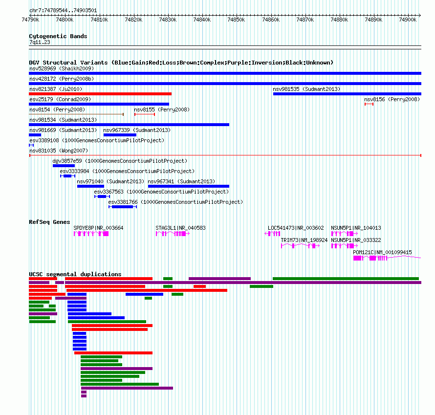 Variant DetailsVariant: nsv831035 | Internal ID | 16108218 | | Landmark | | | Location Information | | | Cytoband | 7q11.23 | | Allele length | | Assembly | Allele length | | hg38 | 113851 | | hg19 | 113958 | | hg18 | 113958 | | hg17 | 113958 |