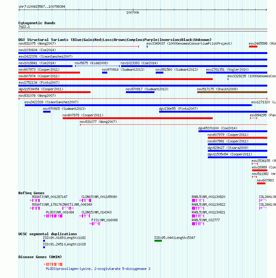 Variant DetailsVariant: nsv831076 Internal ID | 16108259 | Landmark | | Location Information | | Cytoband | 7q22.1 | Allele length | Assembly | Allele length | hg38 | 182828 | hg19 | 182828 | hg18 | 182828 | hg17 | 182828 |