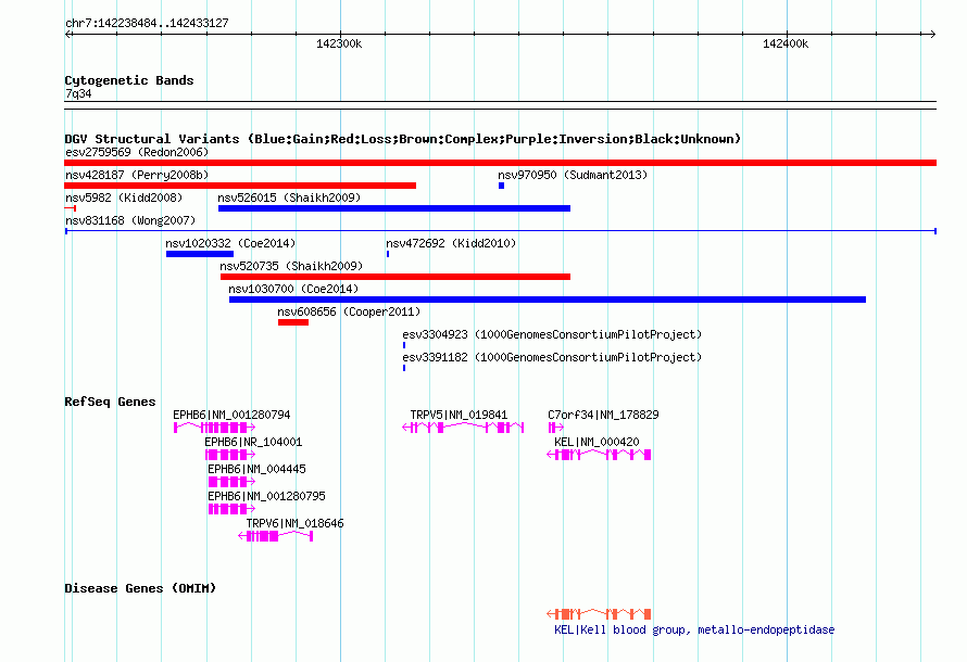 | Variant Type | CNV gain | Copy Number | | Allele State | | Allele Origin | | Probe Count | | Validation Flag | | Merged Status | M | Merged Variants | | Supporting Variants | nssv1446567 | Samples | | Known Genes | C7orf34, EPHB6, KEL, TRPV5, TRPV6 | Method | BAC aCGH | Analysis | Experimental SDs (SDautosome) were calculated for each experiment on the basis of the log2 ratios of the 24,392 reliable clones minus the clones removed because of low signal-to-noise ratio (SNR) or high SD of replicate clone measures (SDclone). Thresholds for determining CNV clones were set at a multiple of the SDautosome value. For each experiment, clones were annotated as uninformative if they were filtered via SNR or SDclone, as a CNV loss if the log2 ratio was less than the negative threshold, as unchanged if the log2 ratio was between the negative and positive thresholds, and as a CNV gain if the log2 ratio was above the positive threshold. | Platform | GPL2616 | Comments | | Reference | Wong_et_al_2007 | Pubmed ID | 17160897 | Accession Number(s) | nsv831168