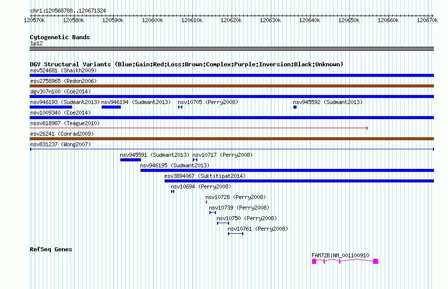 Variant DetailsVariant: nsv831237 | Internal ID | 16455106 | | Landmark | | | Location Information | | | Cytoband | 1p11.2 | | Allele length | | Assembly | Allele length | | hg38 | 102568 | | hg19 | 102537 | | hg18 | 102537 | | hg17 | 102537 |