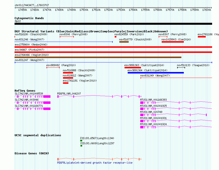 Variant DetailsVariant: nsv831247 | Internal ID | 16108430 | | Landmark | | | Location Information | | | Cytoband | 8p22 | | Allele length | | Assembly | Allele length | | hg38 | 160330 | | hg19 | 160330 | | hg18 | 160231 | | hg17 | 160231 |