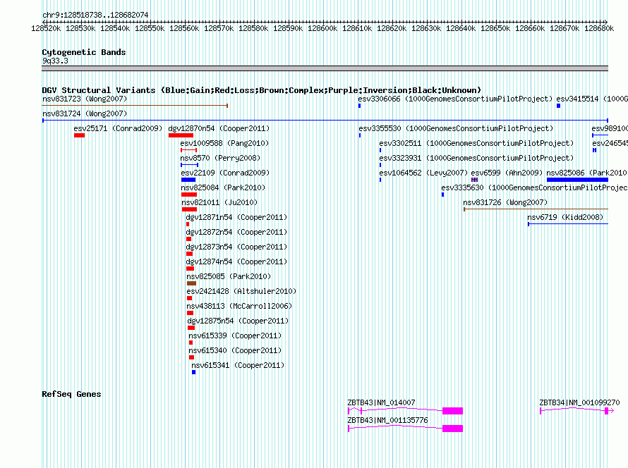 | | Variant Type | CNV gain | | Copy Number | | | Allele State | | | Allele Origin | | | Probe Count | | | Validation Flag | | | Merged Status | M | | Merged Variants | | | Supporting Variants | nssv1448013, nssv1448014, nssv1448015, nssv1448011, nssv1448012 | | Samples | | | Known Genes | ZBTB34, ZBTB43 | | Method | BAC aCGH | | Analysis | Experimental SDs (SDautosome) were calculated for each experiment on the basis of the log2 ratios of the 24,392 reliable clones minus the clones removed because of low signal-to-noise ratio (SNR) or high SD of replicate clone measures (SDclone). Thresholds for determining CNV clones were set at a multiple of the SDautosome value. For each experiment, clones were annotated as uninformative if they were filtered via SNR or SDclone, as a CNV loss if the log2 ratio was less than the negative threshold, as unchanged if the log2 ratio was between the negative and positive thresholds, and as a CNV gain if the log2 ratio was above the positive threshold. | | Platform | GPL2616 | | Comments | | | Reference | Wong_et_al_2007 | | Pubmed ID | 17160897 | | Accession Number(s) | nsv831724