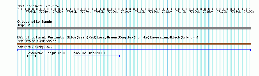 Variant DetailsVariant: nsv831914 | Internal ID | 16455783 | | Landmark | | | Location Information | | | Cytoband | 10q22.2 | | Allele length | | Assembly | Allele length | | hg38 | 170548 | | hg19 | 170548 | | hg18 | 170548 | | hg17 | 170548 |