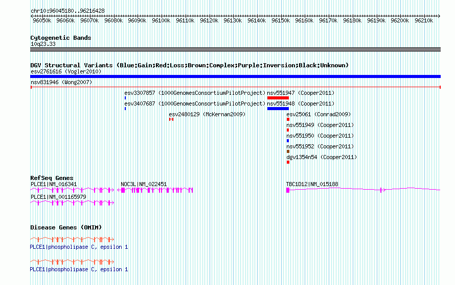 | Variant Type | CNV loss | Copy Number | | Allele State | | Allele Origin | | Probe Count | | Validation Flag | | Merged Status | M | Merged Variants | | Supporting Variants | nssv1448659 | Samples | | Known Genes | NOC3L, PLCE1, TBC1D12 | Method | BAC aCGH | Analysis | Experimental SDs (SDautosome) were calculated for each experiment on the basis of the log2 ratios of the 24,392 reliable clones minus the clones removed because of low signal-to-noise ratio (SNR) or high SD of replicate clone measures (SDclone). Thresholds for determining CNV clones were set at a multiple of the SDautosome value. For each experiment, clones were annotated as uninformative if they were filtered via SNR or SDclone, as a CNV loss if the log2 ratio was less than the negative threshold, as unchanged if the log2 ratio was between the negative and positive thresholds, and as a CNV gain if the log2 ratio was above the positive threshold. | Platform | GPL2616 | Comments | | Reference | Wong_et_al_2007 | Pubmed ID | 17160897 | Accession Number(s) | nsv831946