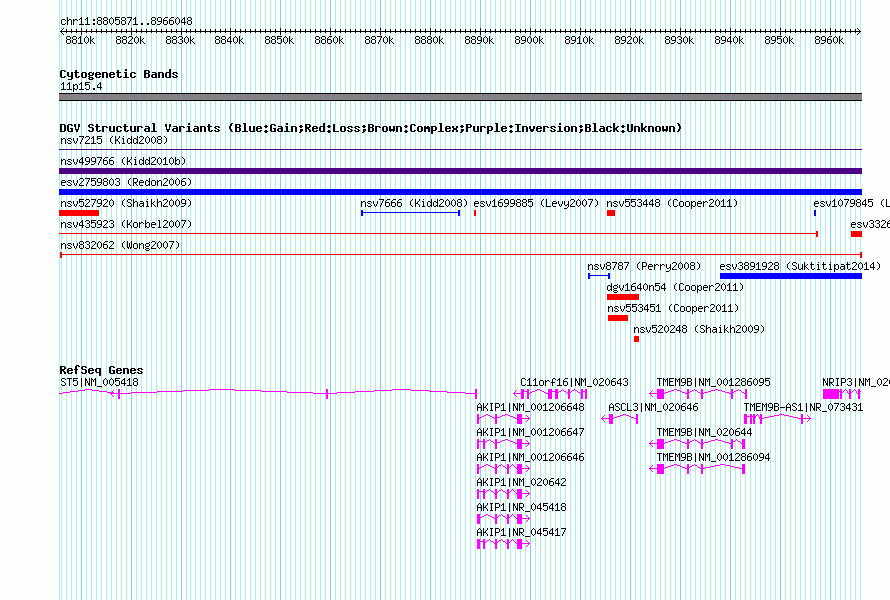 Variant DetailsVariant: nsv832062 | Internal ID | 16455931 | | Landmark | | | Location Information | | | Cytoband | 11p15.4 | | Allele length | | Assembly | Allele length | | hg38 | 160178 | | hg19 | 160178 | | hg18 | 160178 | | hg17 | 160178 |