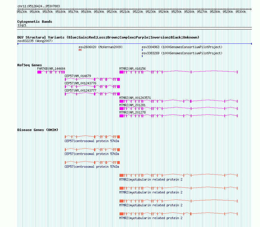 Variant DetailsVariant: nsv832235 | Internal ID | 16109418 | | Landmark | | | Location Information | | | Cytoband | 11q21 | | Allele length | | Assembly | Allele length | | hg38 | 181460 | | hg19 | 181460 | | hg18 | 181460 | | hg17 | 181460 |