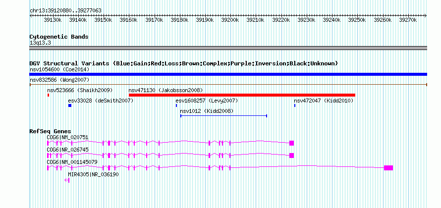 Variant DetailsVariant: nsv832586 Internal ID | 16109769 | Landmark | | Location Information | | Cytoband | 13q13.3 | Allele length | Assembly | Allele length | hg38 | 156184 | hg19 | 156184 | hg18 | 156184 | hg17 | 156184 |