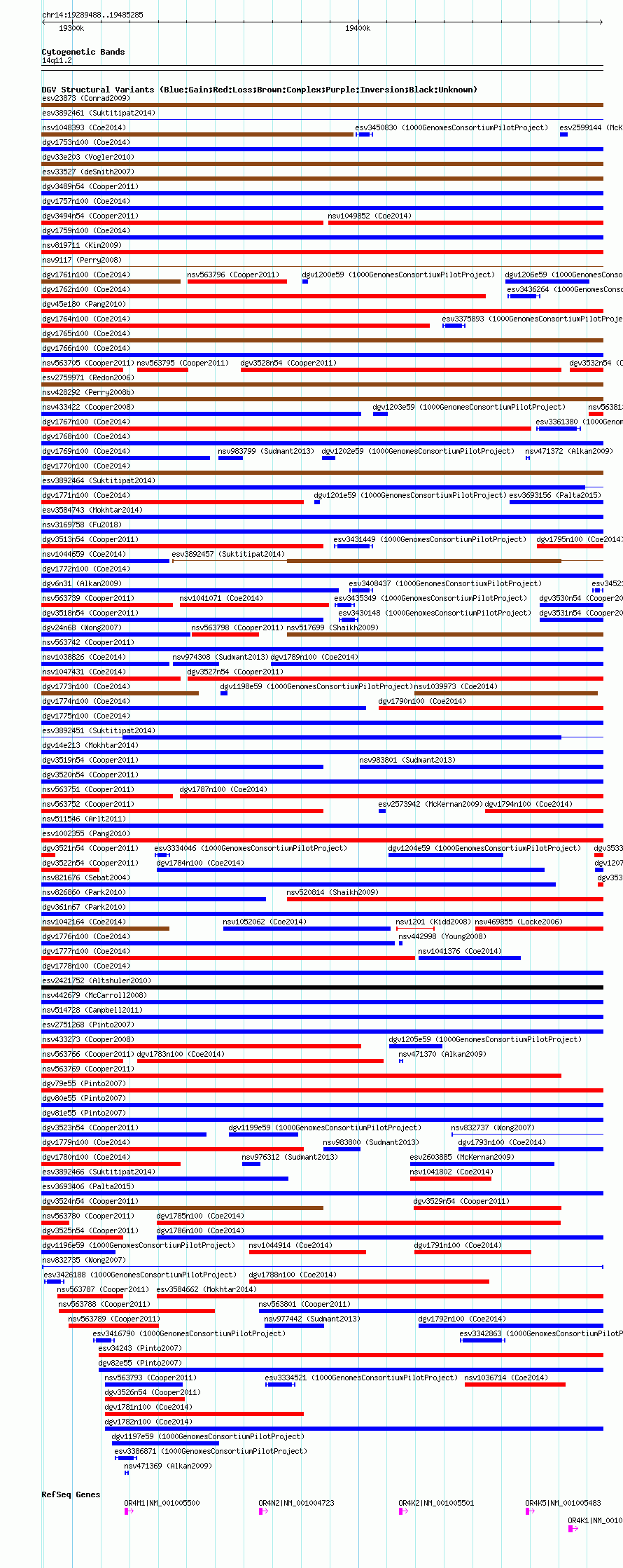 Variant DetailsVariant: nsv832735 | Internal ID | 16456604 | | Landmark | | | Location Information | | | Cytoband | 14q11.2 | | Allele length | | Assembly | Allele length | | hg38 | 195798 | | hg19 | 195798 | | hg18 | 195798 | | hg17 | 195798 |