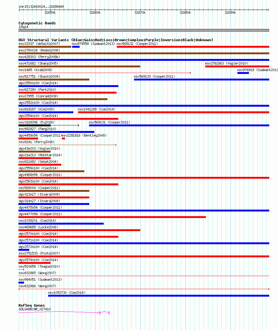 Variant DetailsVariant: nsv832966 | Internal ID | 16456835 | | Landmark | | | Location Information | | | Cytoband | 15q14 | | Allele length | | Assembly | Allele length | | hg38 | 55446 | | hg19 | 55446 | | hg18 | 55446 | | hg17 | 55446 |