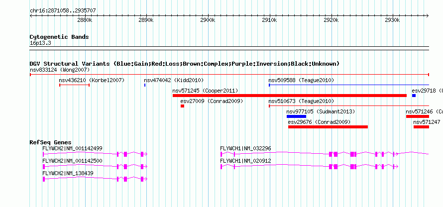 | | Variant Type | CNV loss | | Copy Number | | | Allele State | | | Allele Origin | | | Probe Count | | | Validation Flag | | | Merged Status | M | | Merged Variants | | | Supporting Variants | nssv1452243, nssv1452244, nssv1452245, nssv1452246, nssv1452247 | | Samples | | | Known Genes | FLYWCH1, FLYWCH2 | | Method | BAC aCGH | | Analysis | Experimental SDs (SDautosome) were calculated for each experiment on the basis of the log2 ratios of the 24,392 reliable clones minus the clones removed because of low signal-to-noise ratio (SNR) or high SD of replicate clone measures (SDclone). Thresholds for determining CNV clones were set at a multiple of the SDautosome value. For each experiment, clones were annotated as uninformative if they were filtered via SNR or SDclone, as a CNV loss if the log2 ratio was less than the negative threshold, as unchanged if the log2 ratio was between the negative and positive thresholds, and as a CNV gain if the log2 ratio was above the positive threshold. | | Platform | GPL2616 | | Comments | | | Reference | Wong_et_al_2007 | | Pubmed ID | 17160897 | | Accession Number(s) | nsv833124