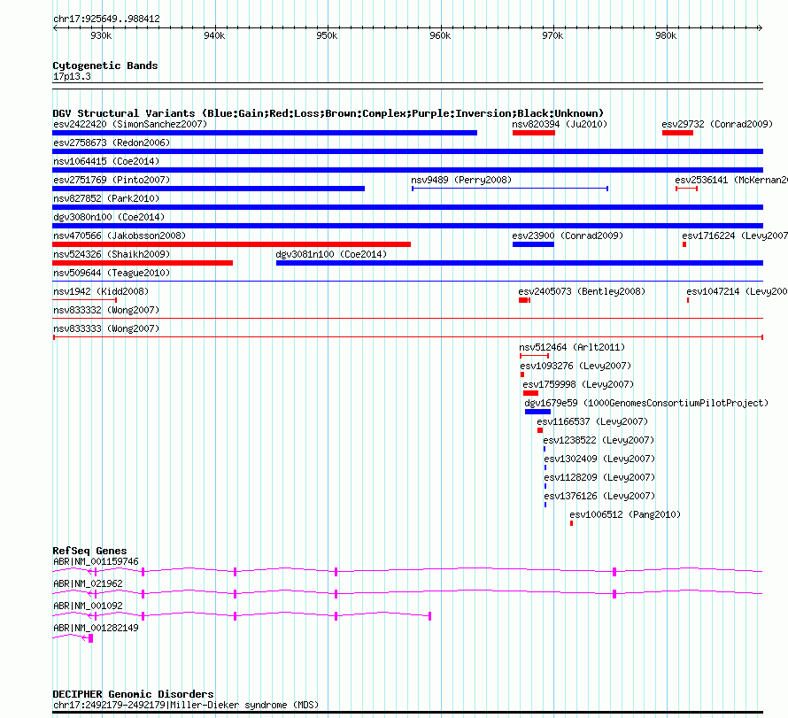 Variant DetailsVariant: nsv833333 | Internal ID | 16457202 | | Landmark | | | Location Information | | | Cytoband | 17p13.3 | | Allele length | | Assembly | Allele length | | hg38 | 62795 | | hg19 | 62764 | | hg18 | 62764 | | hg17 | 62764 |