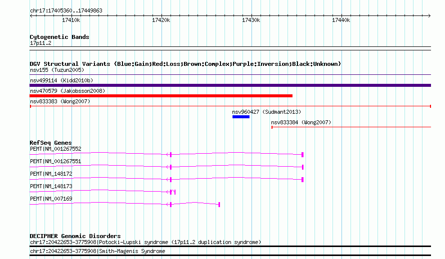 Variant DetailsVariant: nsv833383 | Internal ID | 16457252 | | Landmark | | | Location Information | | | Cytoband | 17p11.2 | | Allele length | | Assembly | Allele length | | hg38 | 44504 | | hg19 | 44504 | | hg18 | 44504 | | hg17 | 44504 |