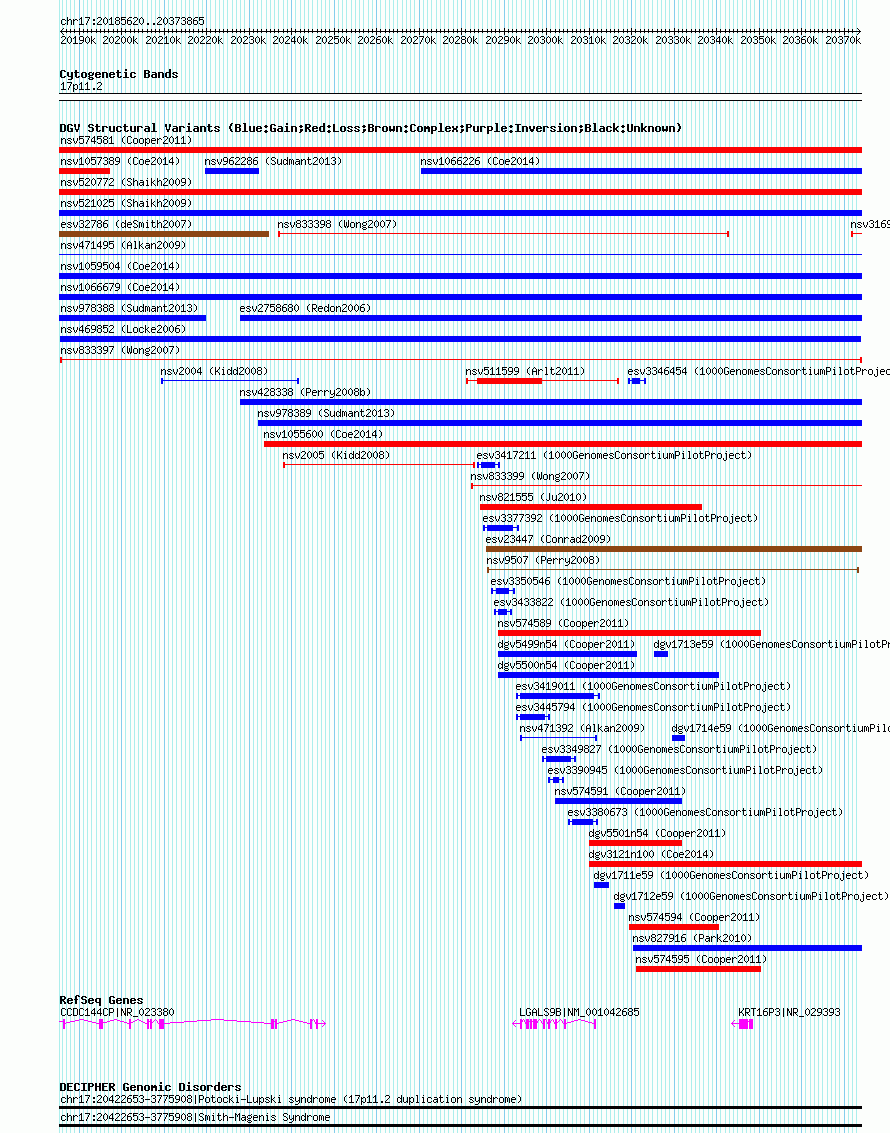 Variant DetailsVariant: nsv833397 | Internal ID | 16457266 | | Landmark | | | Location Information | | | Cytoband | 17p11.2 | | Allele length | | Assembly | Allele length | | hg38 | 188246 | | hg19 | 188246 | | hg18 | 188246 | | hg17 | 188246 |