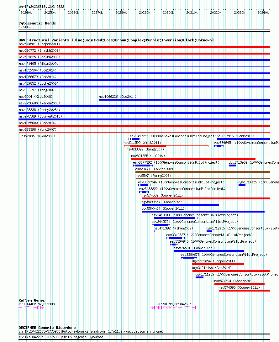Variant DetailsVariant: nsv833398 | Internal ID | 16457267 | | Landmark | | | Location Information | | | Cytoband | 17p11.2 | | Allele length | | Assembly | Allele length | | hg38 | 105805 | | hg19 | 105805 | | hg18 | 105805 | | hg17 | 105805 |