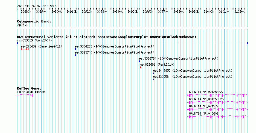 Variant DetailsVariant: nsv833659 | Internal ID | 16457528 | | Landmark | | | Location Information | | | Cytoband | 2p23.1 | | Allele length | | Assembly | Allele length | | hg38 | 150934 | | hg19 | 150934 | | hg18 | 150934 | | hg17 | 150934 |