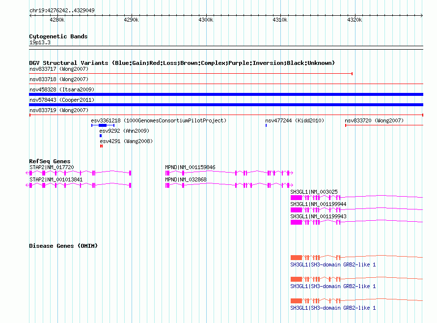 | | Variant Type | CNV loss | | Copy Number | | | Allele State | | | Allele Origin | | | Probe Count | | | Validation Flag | | | Merged Status | M | | Merged Variants | | | Supporting Variants | nssv1454276, nssv1454275, nssv1454273, nssv1454274, nssv1454272, nssv1454271 | | Samples | | | Known Genes | MPND, SH3GL1, STAP2 | | Method | BAC aCGH | | Analysis | Experimental SDs (SDautosome) were calculated for each experiment on the basis of the log2 ratios of the 24,392 reliable clones minus the clones removed because of low signal-to-noise ratio (SNR) or high SD of replicate clone measures (SDclone). Thresholds for determining CNV clones were set at a multiple of the SDautosome value. For each experiment, clones were annotated as uninformative if they were filtered via SNR or SDclone, as a CNV loss if the log2 ratio was less than the negative threshold, as unchanged if the log2 ratio was between the negative and positive thresholds, and as a CNV gain if the log2 ratio was above the positive threshold. | | Platform | GPL2616 | | Comments | | | Reference | Wong_et_al_2007 | | Pubmed ID | 17160897 | | Accession Number(s) | nsv833719