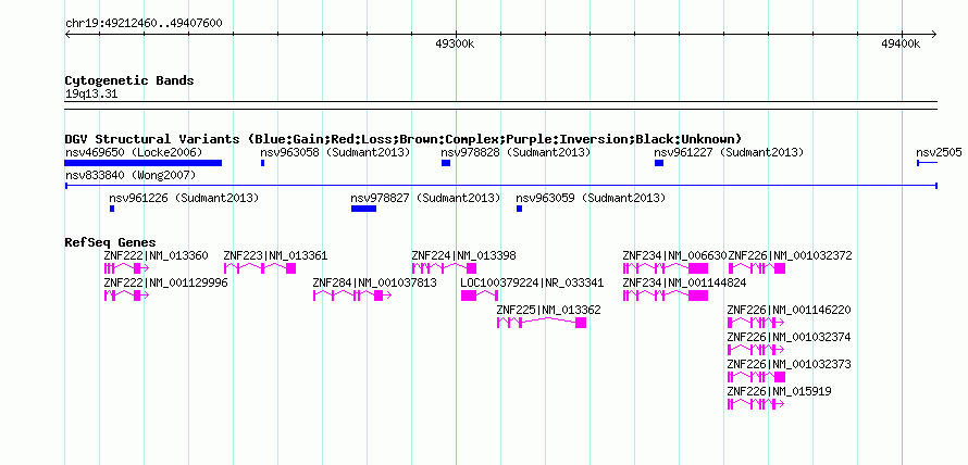 Variant DetailsVariant: nsv833840 Internal ID | 16111023 | Landmark | | Location Information | | Cytoband | 19q13.31 | Allele length | Assembly | Allele length | hg38 | 195140 | hg19 | 195141 | hg18 | 195141 | hg17 | 195141 |